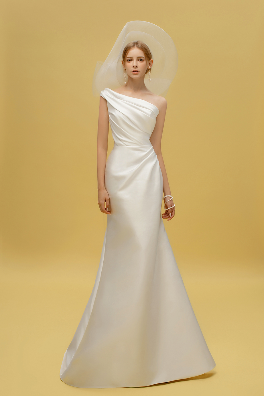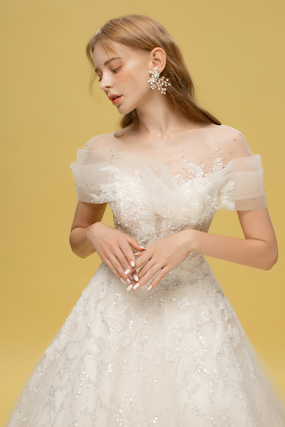 - 키가 작은 체형: V자의 디자인이 상반신을 연장하는 효과가 있어, 키가 작은 신부들에게도 어울림