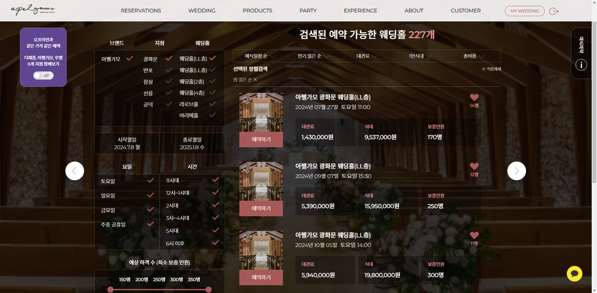 플래너를 통해 상담 예약을 잡았으나 결론적으로 아펠가모 인터넷 예약시스템에서 확인한 가격과 1원 차이 없이 동일한 견적이었습니다. 그리고 다른 홀을 알아보기 전에 아펠가모의 "스마트 예약" 시스템을 통해 기준 잡고 알아볼 수 있어 좋았습니다. 또한, 많이 바쁘신 분들이라면 스마트 예약 시스템으로 실시간 잔여일과 가격 확인하시고 예약하는 거 추천드립니다. 저의 경우는 플래너 연락 기다리지 않아도 되어 너무 좋았습니다!