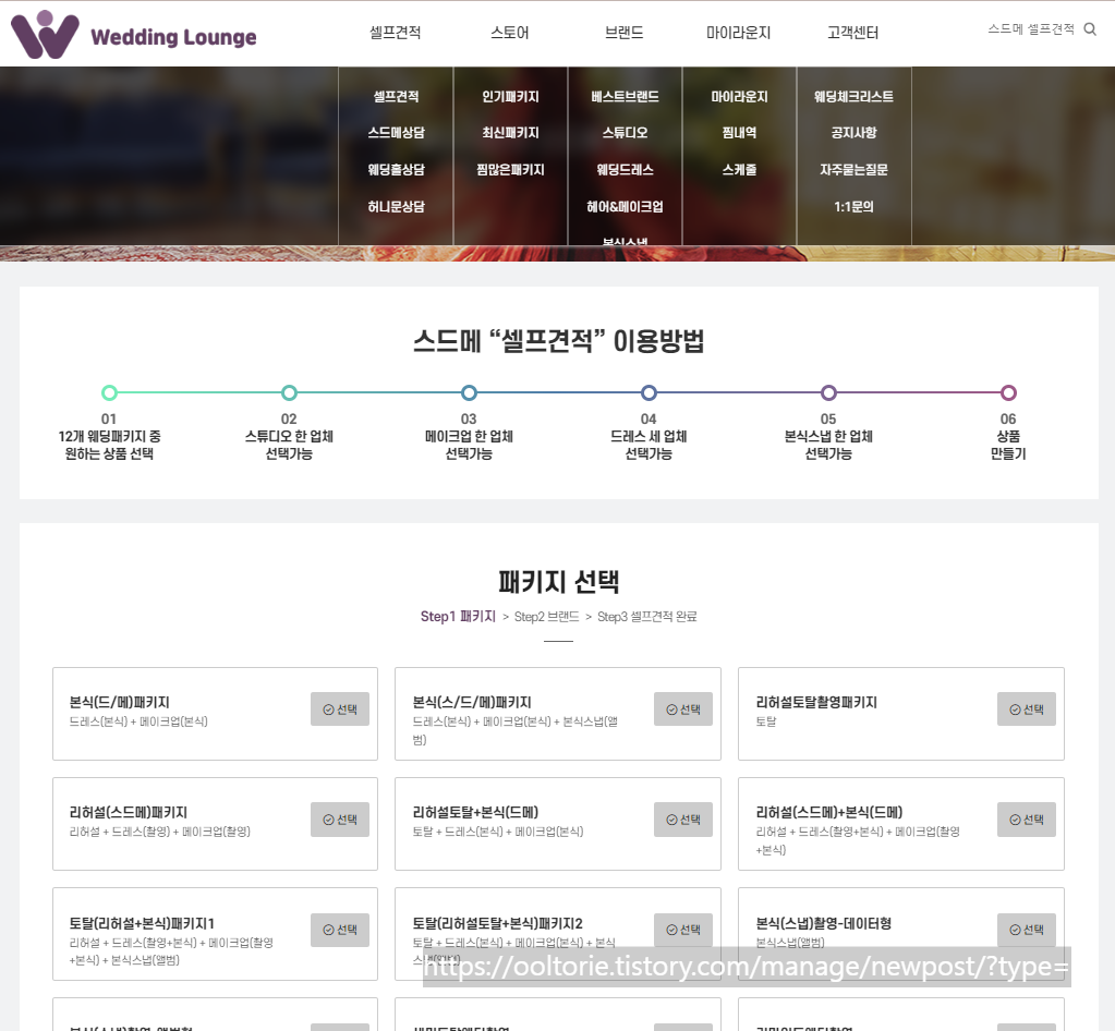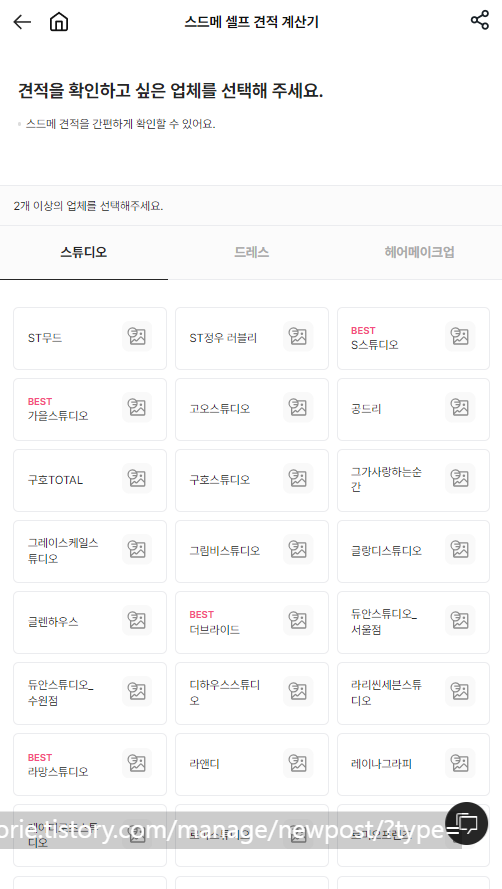 플래너분들께 여쭤보면 가장 답답한 부분이 스튜디오, 드레스, 메이크업 등 각 항목마다 자세한 견적을 내주지 않고 패키지로 견적을 알려주시는 부분입니다. 이런 불투명한 시장 정말 답답합니다. 그나마 셀프로 견적을 내볼 수 있는 사이트 중에 제가 이용하기 편했던 사이트 2개 추천드립니다.
