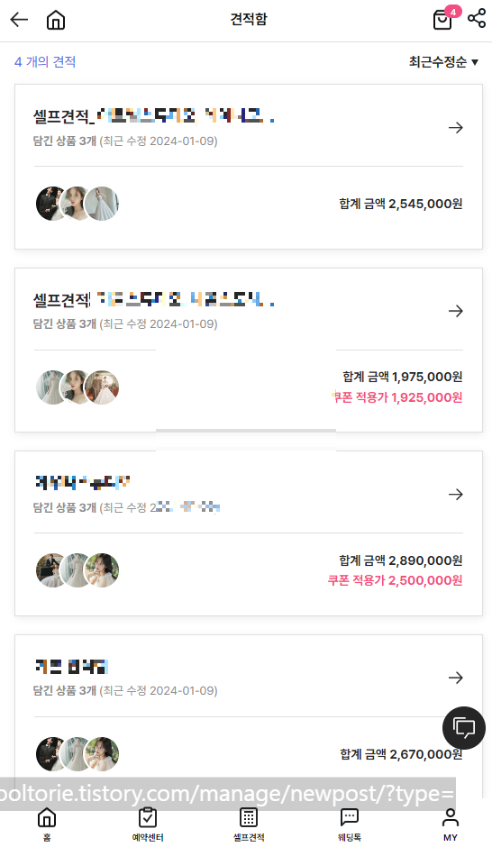 2) 추린 업체를 기준으로 최대한 많은 견적을 받아봅니다. 이때, 제휴업체가 아니면 견적을 받기 어려울 수 있고, 이럴 경우에는 비슷한 가격과 퀄리티의 업체로 대체해서 견적을 받아봅니다.